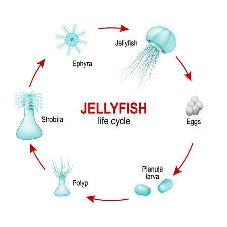 Moon jelly (Aurelia aurita). life cycle of jellyfish from eggs to larva, Polyp, Strobila and Ephyra. Jellyfish reproduce both sexually and asexually. One generation (medusa) reproduces sexually, next generation (polyp) reproduces asexually.