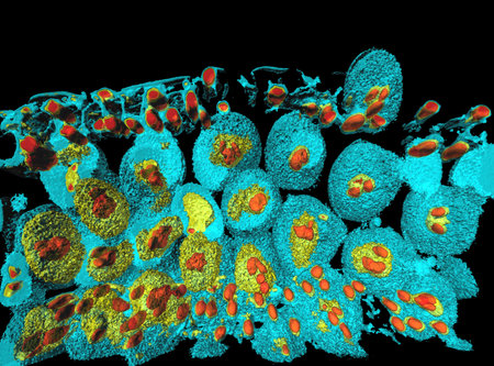 Arabidopsis thaliana pollen grains in anther, fluorescent staining of DNA by Hoechst 33342 and modelling by surface rendering software.