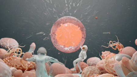 Scaled-down scientists in spacesuits explore a surreal microcosm or another dimension, living cell