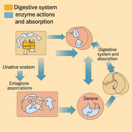 Diagram showing digestive system enzyme actions and absorption.