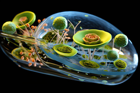 Group of green plant or algae cells on dark background, micro view. Medical and microbiological scientific research illustration. 3D rendering
