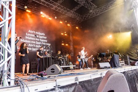 Kiel, Germany - June 26th 2019: The Brasspop-Band Querbeat from Cologne is performing on the Rathaus Stage during the 125th Kiel Week