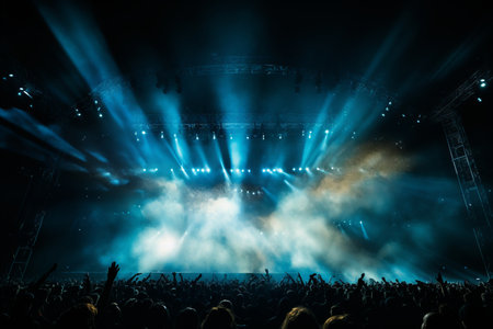 A crowded concert hall with scene stage lights, live show performance, with people silhouette, dance floor during a concert open-air festival