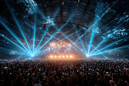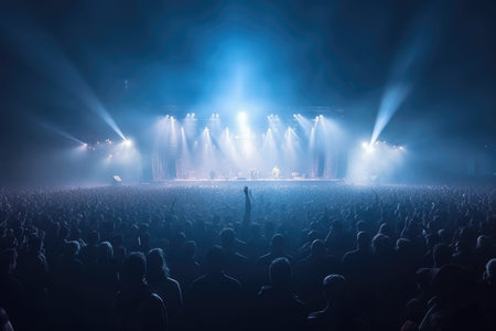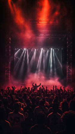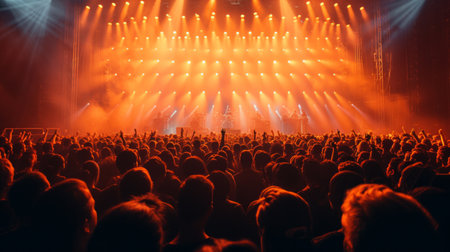 A dynamic live concert featuring musicians performing on stage with colorful lights shining and a lively crowd cheering passionately, capturing the essence of live music energy and excitement. AI generated image