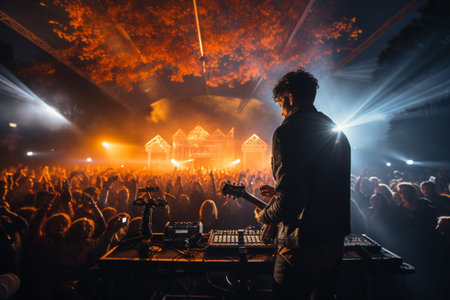 silhouette of a DJ during a musical performance at night, as he holding headphone and using electronic music equipment with lights and smoke in the background