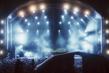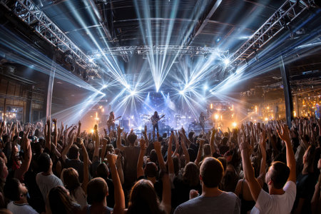 Stage lights and crowd of audience with hands raised at a music festival. Fans enjoying the party vibes.