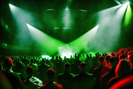 A crowded concert hall with scene stage green lights, rock show performance, with people silhouette, confetti explosion fired on dance floor air during a concert festival