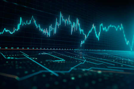 A detailed close-up view of a candlestick chart displaying stock data. The graphic illustrates financial trends with vibrant colors, aiding data analysis.