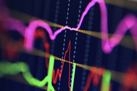 Indicators including volume analysis for professional technical analysis on the monitor of a computer. Fundamental and technical analysis concept.