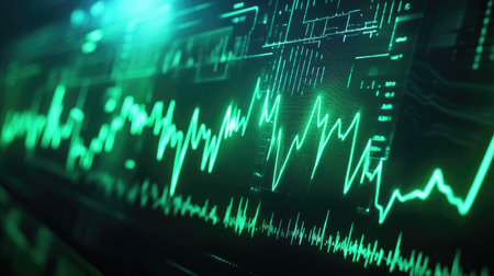 A Digital heartbeat visualization with vibrant red lines and data graphs
