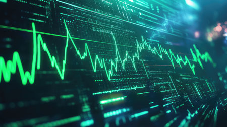 Glowing green digital financial chart displaying stock market trends and data analysis