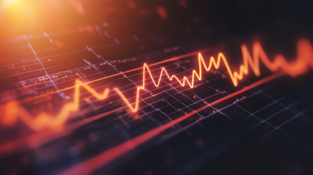 Vibrant abstract visualization showcasing fluctuating data trends in vivid orange lines, emphasizing the interplay of technology and innovation in a digital landscape.