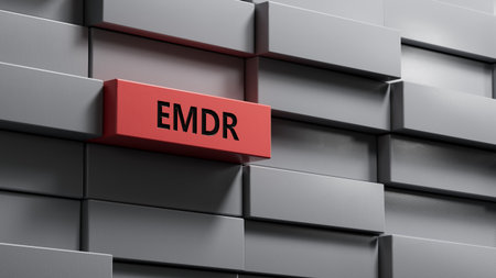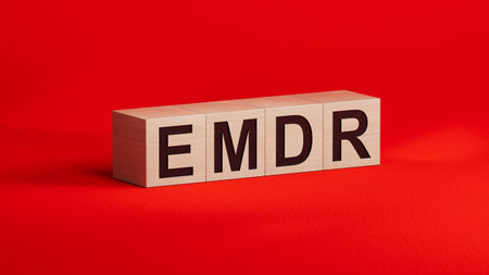 The text EMDR word Eye Movement Desensitization is written on notepad. Medical concept.close up of metal blocks.3D rendering.
