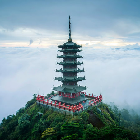 chinese pagoda overlooking vast expanse of misty mountains, with clear blue skies and white clouds, created with generative ai