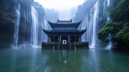 Pagoda and waterfalls in the mist in Taipei, Taiwan