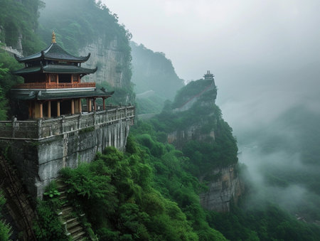 Traditional oriental architecture on top of a cliff, surrounded by dense green forest and fog.