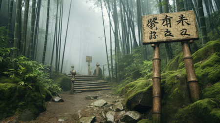 Experience tranquility in this enchanting bamboo forest, where a serene pathway beckons through lush greenery and a mystical mist envelops the scene.