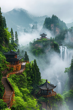 Serene scene of a traditional chinese pagoda standing tall amidst a lush, misty forest