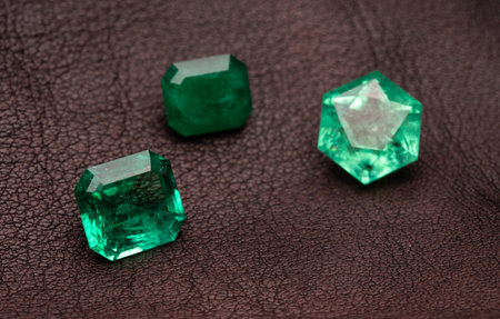 Three green gemstones are on a brown surface. The stones are all different shapes and sizes. Scene is calm and peaceful, as the stones are arranged neatly on the surface