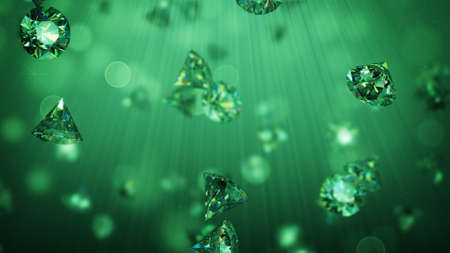 Emerald green brilliants are falling. Abstract luxury background. 3D rendering