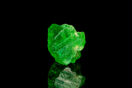 Rare natural rough tsavorite garnet gemstone on dark background (selective focus)