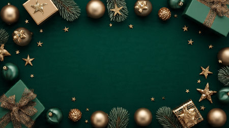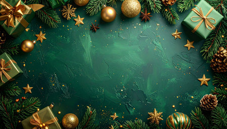 A festive green Christmas border frames a textured dark green background with gold ornaments, gifts, pine branches, and pinecones.