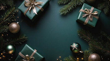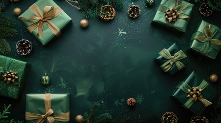 beautifully arranged flat lay features green gift boxes adorned with decorations surrounded by pine branches and Christmas ornaments perfect for festive occasions.