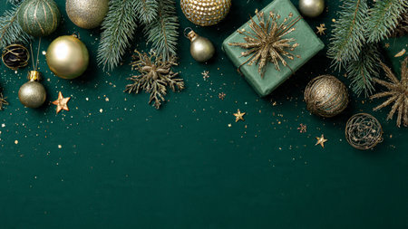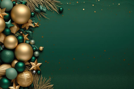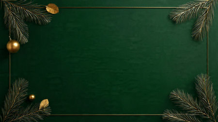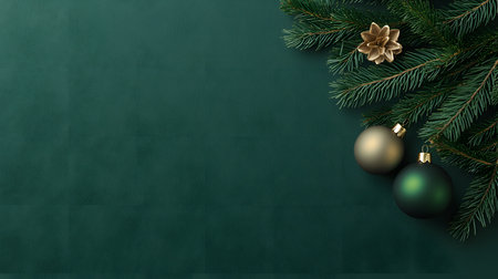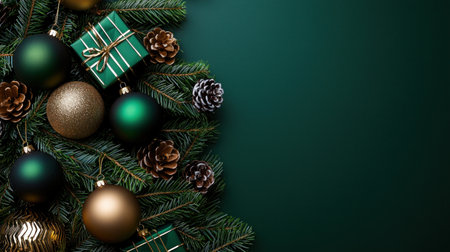 A festive Christmas fir branch is adorned with golden and green ornaments. The deep green background evokes a sense of winter elegance.