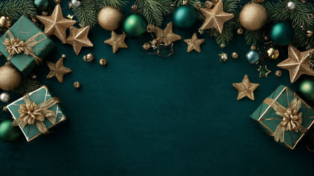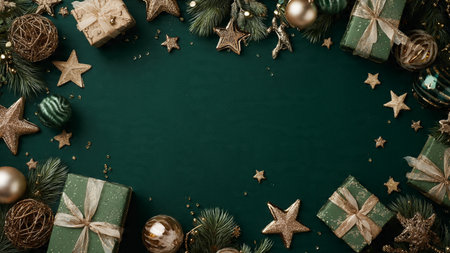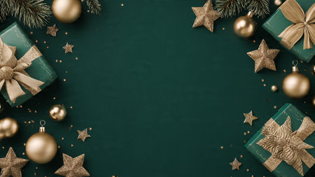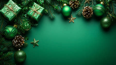 A vibrant Christmas background featuring green ornaments, gifts, pine cones, and stars, designed to provide ample space for adding personalized holiday messages or greetings.