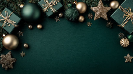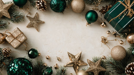 Premium winter layout with champagne-gold ornaments placed gracefully on a rich emerald background.