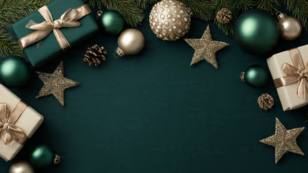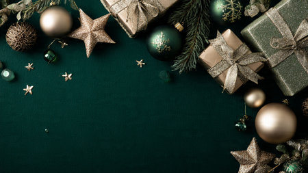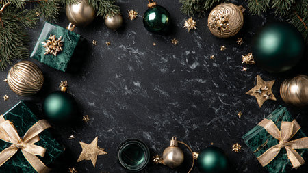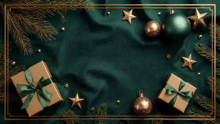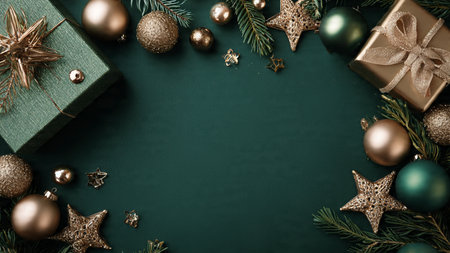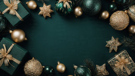 Luxurious Christmas design with soft light illuminating gold ornaments on an emerald surface.