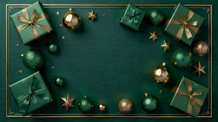 Luxurious holiday composition featuring deep emerald tones paired with warm champagne-gold brilliance.