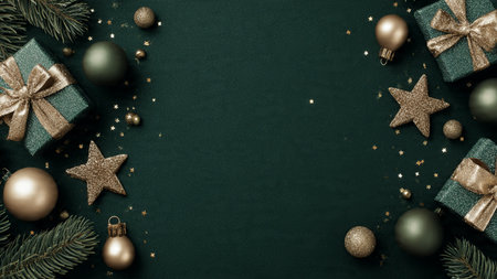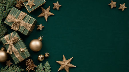Elegant holiday composition featuring deep-green matte textures illuminated softly by gold metallic highlights.