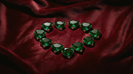 A stunning heart-shaped formation of green gemstones beautifully displayed on a rich red velvet background, symbolizing elegance and luxury in design.
