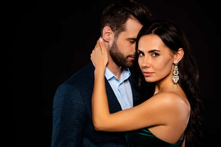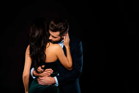 Close-up portrait of his he her she nice-looking attractive shine luxury passionate adorable sophisticated two person caressing St Valentine day event isolated over black background