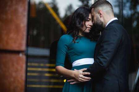 Couple in love - Beginning of a Love Story. A man and woman in evening dress, embrace and kiss while walking