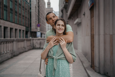 urban young romantic couple on the street hugging