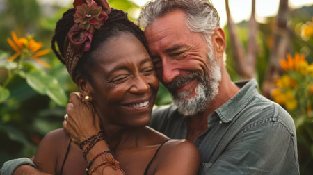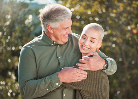 Senior woman embracing man outdoors, expressing enduring love and connection