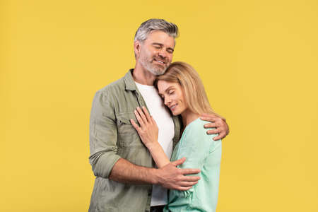 Portrait of loving middle aged spouses hugging with closed eyes while standing isolated over yellow studio background