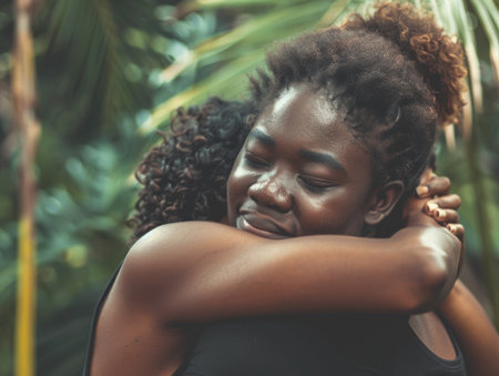 Two women sharing a warm hug in front of lush palm trees.