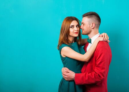 hipster couple in love with a bouquet of flowers in the studio at Christmas, the concept of Valentine's Day
