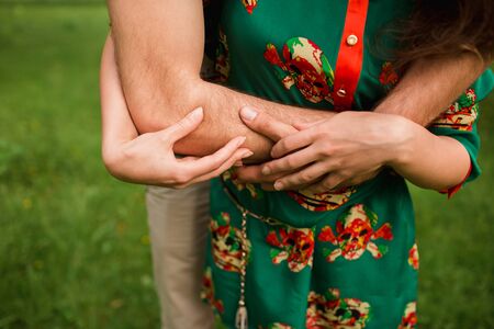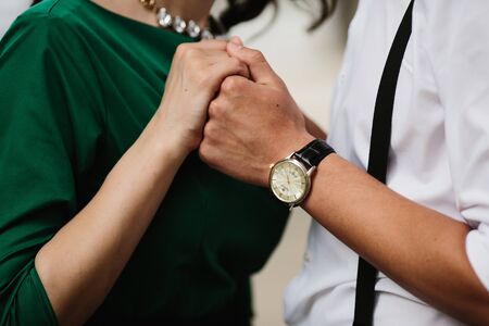 Close up of hands of man and woman in black clothes. Man holding woman's hands.