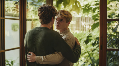In a warmly lit room adorned with vibrant plants, two young men stand closely together in an affectionate embrace, exchanging tender glances and smiles.