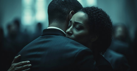 Two individuals embrace in a profound silent hug, conveying emotion and connection during a serene evening. Soft lighting accentuates their expressions.