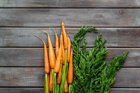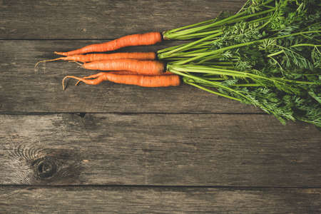 Fresh organic carrots with green leaves on wooden background. Vegetables. Healthy food concept