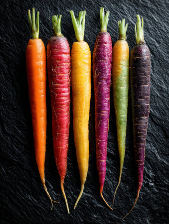 High contrast colorful carrots arranged on black slate highlight their vivid colors, creating an attractive presentation perfect for culinary enthusiasts.