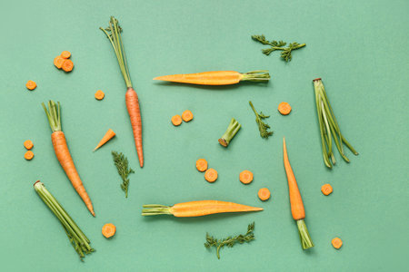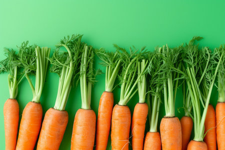Top view of vibrant orange carrots with greens arranged neatly on a bright green surface