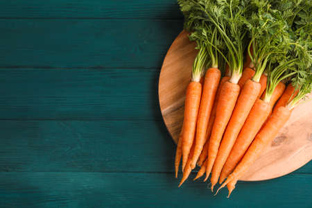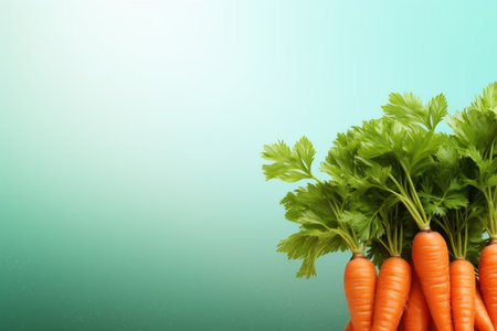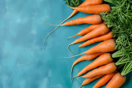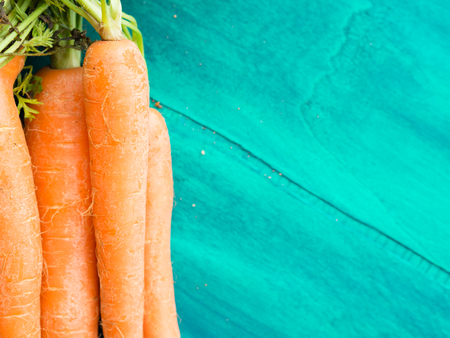 Vibrant organic orange carrots with green leafy tops, shot from above on a teal background with a place for text