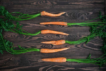 Fresh ripe carrots with green leaves on a wooden background. Healthy vegan eating. Flat lay
