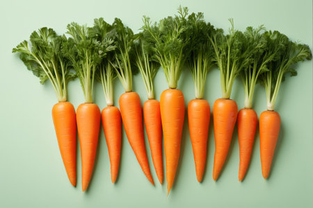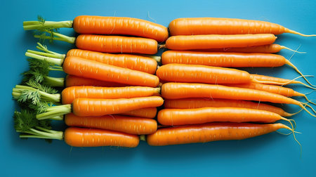 Bright orange carrots with vibrant green tops are arranged neatly against a light blue background, showing their freshness and appeal.